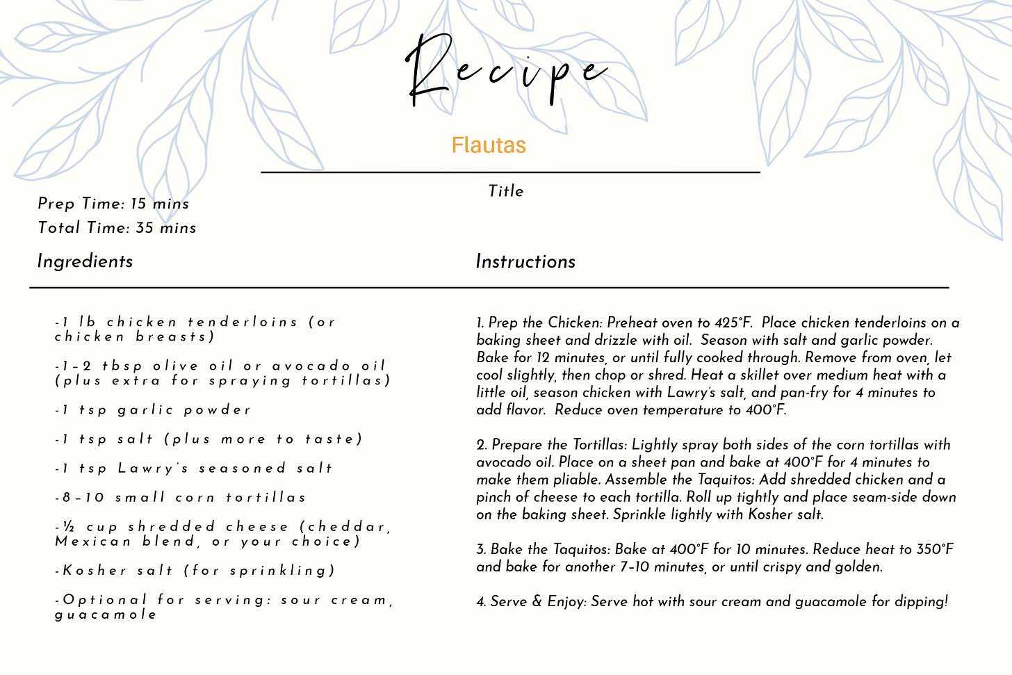 Here is the recipe for flautas that I’ve been making for my family. It’s not perfect like moms, but it’s pretty good.
