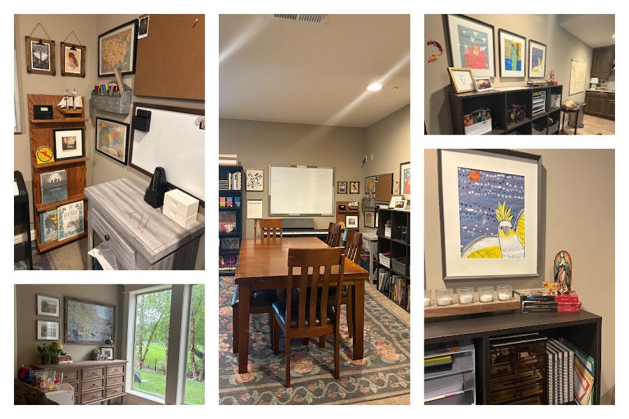 I really enjoy prepping this space in our basement. We’ve been pulling it together for the past two years after schooling in our kitchen and in the dining room for years. Having a designated school room or basement is by no means necessary, but it has definitely been nice to cultivate this area. Being able to place school things in the school area, rather than having it in our main living space, clears up the clutter and chaos a bit in our home.