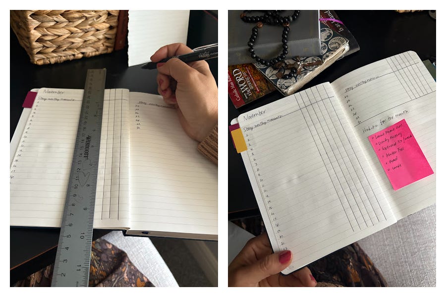 On the same page, I create a grid of vertical lines where I track certain habits I want to cultivate.