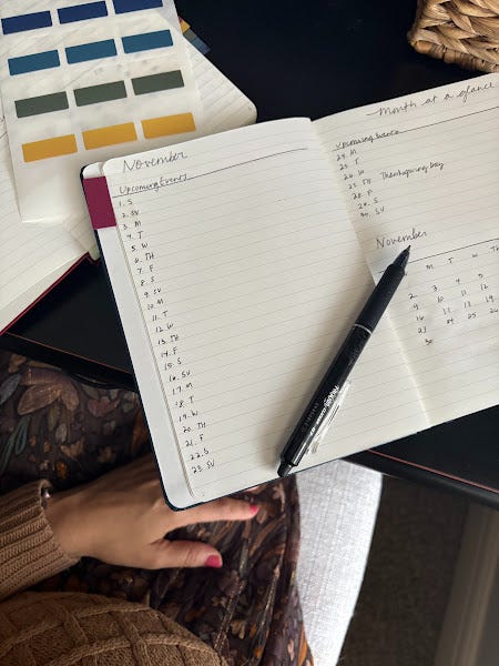At the start of the month, I create a simple calendar list, numbering the days vertically. I leave space to write down any important events or dates I want to remember for the month. I also create a simple month-at-a-glance.