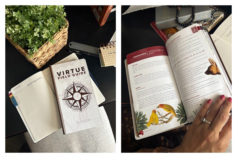 The best book I’ve found on virtue building is The Virtue Field Guide, by Disciple of Christ. This Handbook is intended for teens/young adults, but it was exactly what I was looking for when seeking to grow in personal virtue and pray for my kids. (I cannot believe that there aren’t more books like this out there!) Not only is it beautiful, but it includes descriptions of each virtue, prayers, dedicated saints, and journaling prompts for so many different virtues.