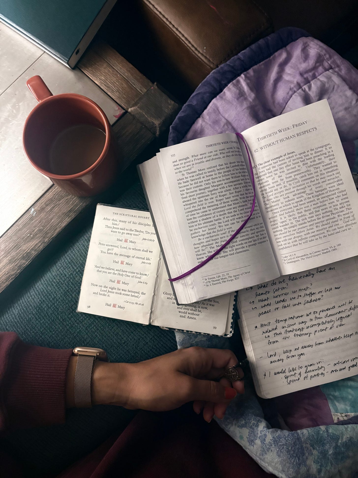 I also find it important to have a gathering space for all my essentials. I keep a small bucket by my chair where I store my pens, Bible, rosary, journal, and meditation books. (Having to pause to find your materials can interrupt prayer’s momentum, so it’s worth giving them a permanent home.)